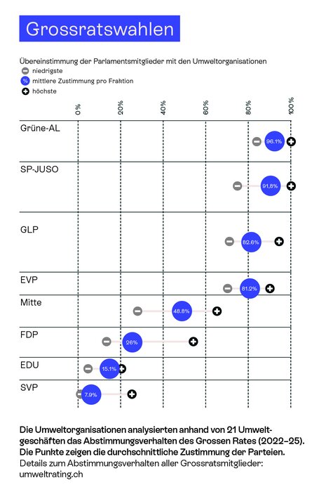 Die Unterschiede sind überraschend gross. Das Umweltrating belegt, dass Grüne und SP im Grossen Rat konsequent im Sinne der Umwelt stimmen, gefolgt von GLP und EVP. Am unteren Ende der Rangliste stehen SVP und EDU: Ihre Vertreter:innen lehnen Umweltanliegen in der Regel ab. Besonders besorgniserregend ist der Abwärtstrend bei der FDP: Gegenüber dem letzten Umweltrating vor vier Jahren büssten die Freisinnigen rund 15 Prozentpunkte ein, ihre Politiker:innen votierten in der Legislatur 2022-2025 nur noch bei einer von vier Abstimmungen für Natur und Klima.